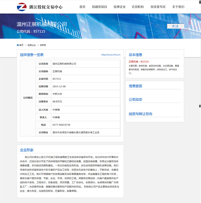 正展機械2014年12月8日在浙江股權(quán)交易中心正式掛牌