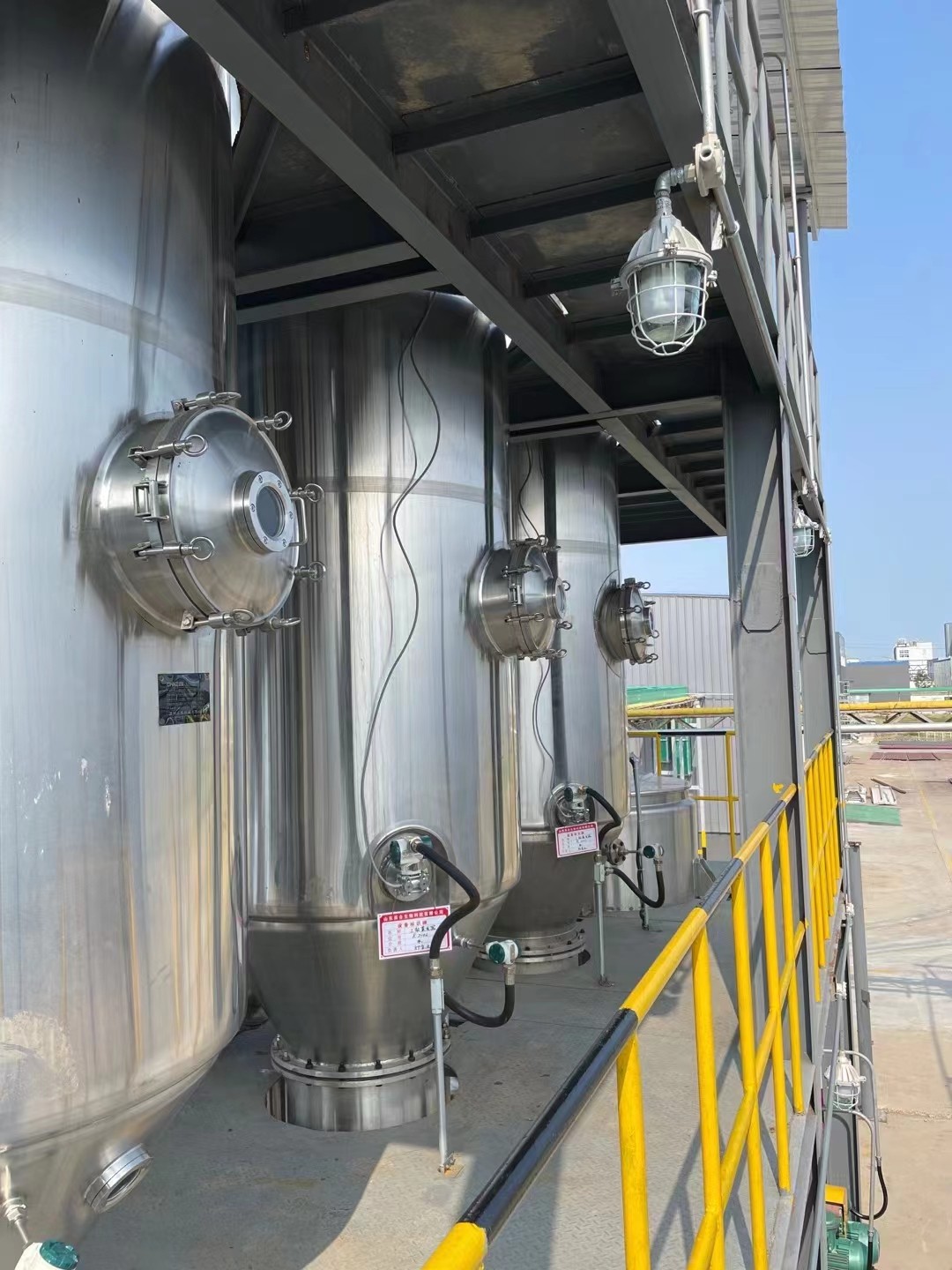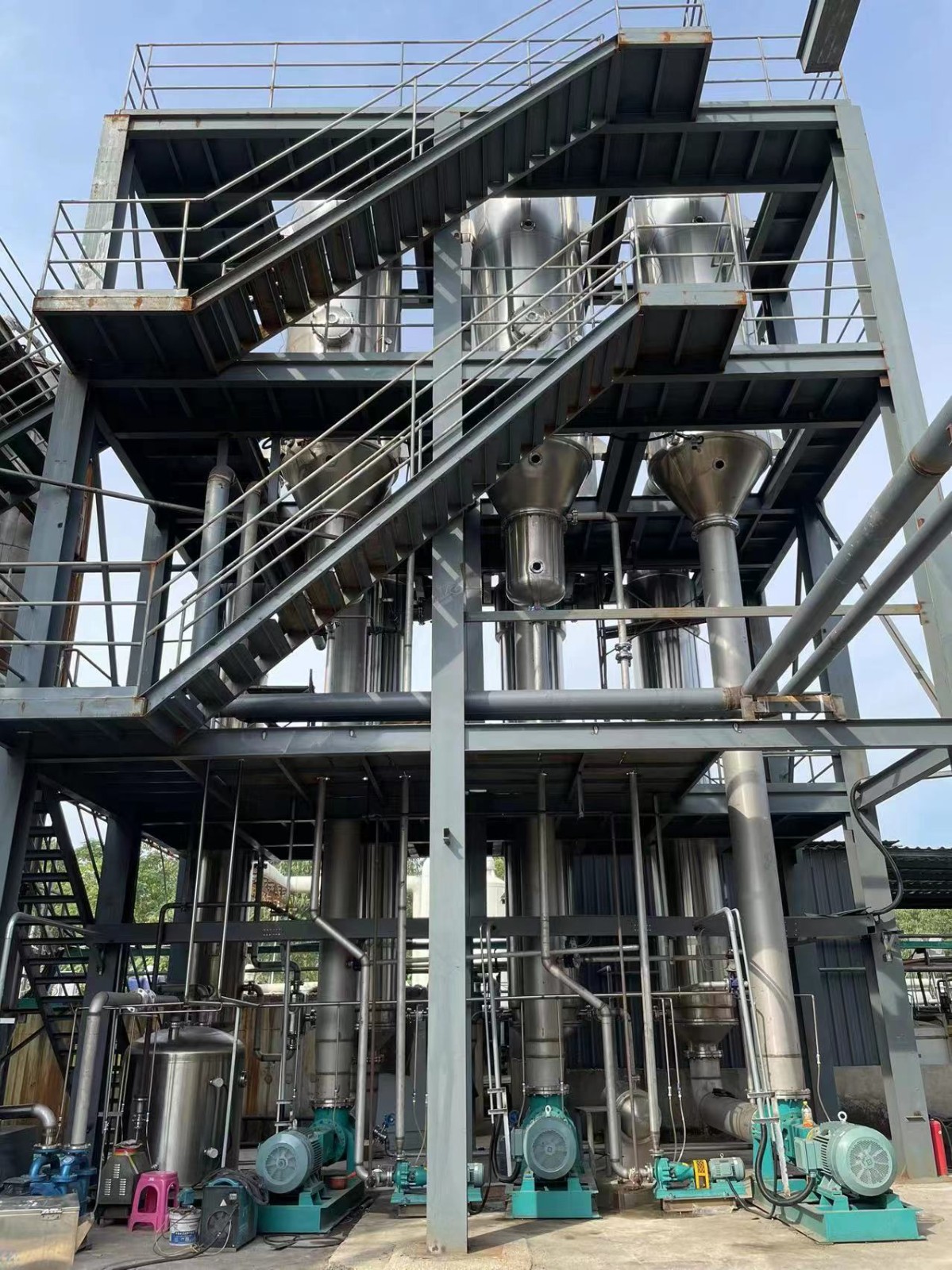 各效加熱器、各效分離器、各效結晶器、冷凝器(混合式或表面式)、各效強制循環(huán)泵、冷凝水泵、真空泵、操作平臺、電器控制柜、液位自控系統(tǒng)及界內管道閥門等組成。